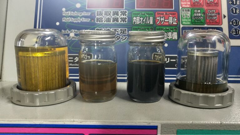 ガラス瓶にも取って新旧オイルを比較してくれました。