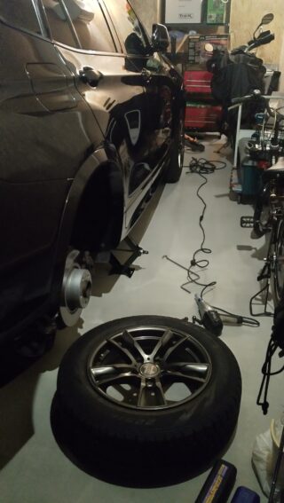 タイヤ交換作業は、雨が降っている中完成した新築インナーガレージ内で夜遅くに行いました。